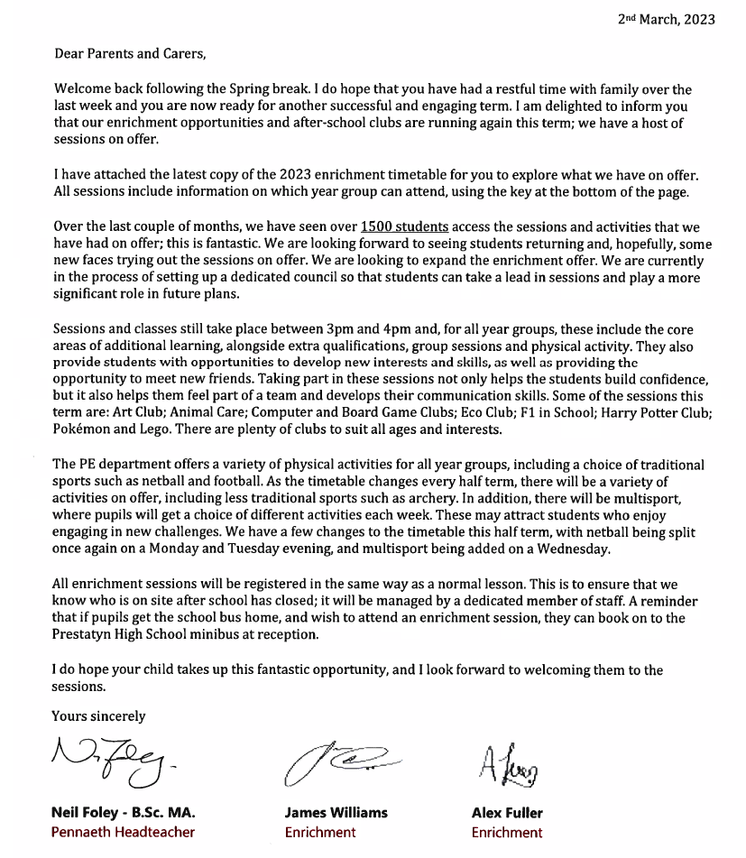 As you will be aware, the strike action scheduled for the 14th February was postponed due to some progress in the talks between the unions and Welsh Government. This industrial action was postponed to the 2nd March to allow for further negotiations. Despite these negotiations, there has not been a sufficient breakthrough and, therefore, the NEU teaching union has announced a second day of national strike action on the 2nd March, 2023. This dispute is not with the school, but with the Welsh Government over pay and the funding for schools. We accept that this continued action is frustrating and disruptive for parents. For further information on why teaching unions are taking this action, please read the additional document I attached to the last letter sent out in January.
