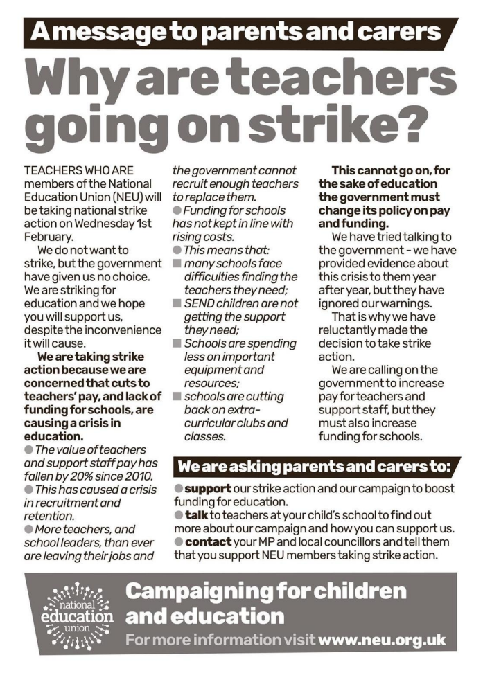 I do hope you are well. You may be aware from media coverage that similar to other public sector workers, some teaching unions have declared strike action. The proposed industrial action will take place on: Wednesday 1st February 2023; Tuesday 14th February 2023; Wednesday 15th March 2023 and Thursday 16th March 2023.